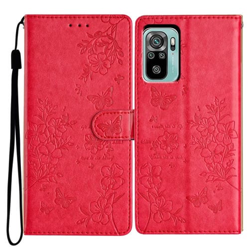 Para Redmi Note 10 4G Funda de Cuero para Teléfono con Mariposas y Flores (Rojo)