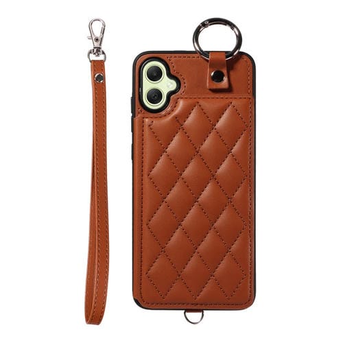 Estuche para Teléfono Samsung Galaxy A05 con Bolsa para Tarjetas Textura Rómbica y Cordón Corto (Marrón)