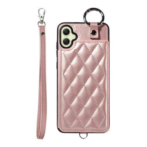 Estuche para Teléfono Samsung Galaxy A05 con Bolsa para Tarjetas Textura Rómbica y Cordón Corto (Oro Rosa)