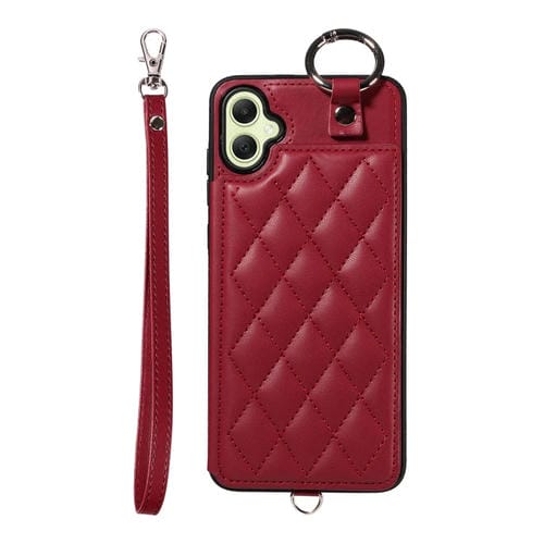 Estuche para Teléfono Samsung Galaxy A05 con Bolsa para Tarjetas Textura Rómbica y Cordón Corto (Rojo Vino)