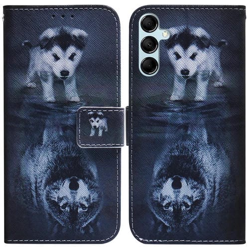 Funda de Cuero para Samsung Galaxy A15 con Tapa y Dibujo Coloreado (Lobo y Perro)