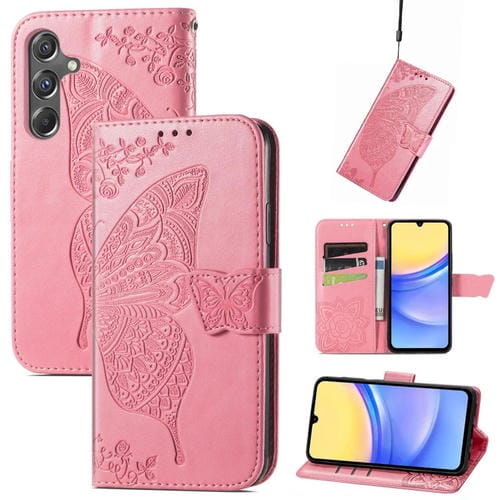 Funda para Teléfono Samsung Galaxy A15 Cuero con Relieve Flor de Amor y Mariposa (Rosa)
