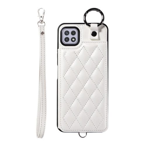 Estuche para Teléfono Samsung Galaxy A22 5G con Bolsa para Tarjetas Textura Rómbica y Cordón Corto (Blanco)