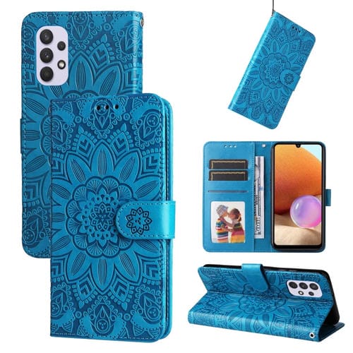 Estuche para teléfono Samsung Galaxy A32 4G Cuero Estampado de Girasol en Relieve (Azul)