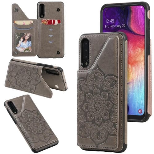 Estuche Protector Samsung Galaxy A50 Flor Patrón Grabado En Relieve a Prueba de Golpes con Soporte y Ranuras para Tarjetas (Gris)