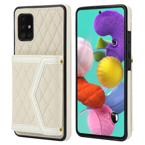 Estuche para Teléfono Samsung Galaxy A51 5G con Bolsa para Tarjetas Textura Rómbica Empalme Cordón Largo (Beige)