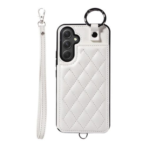 Estuche para Teléfono Samsung Galaxy A54 5G con Bolsa para Tarjetas Textura Rómbica y Cordón Corto (Blanco)