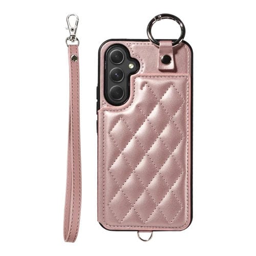 Estuche para Teléfono Samsung Galaxy A54 5G con Bolsa para Tarjetas Textura Rómbica y Cordón Corto (Oro Rosa)