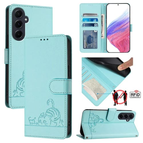 Estuche para Teléfono Samsung Galaxy A55 5G Cat Rat Cuero Rfid Patrón en Relieve y Cordón (Verde Menta)