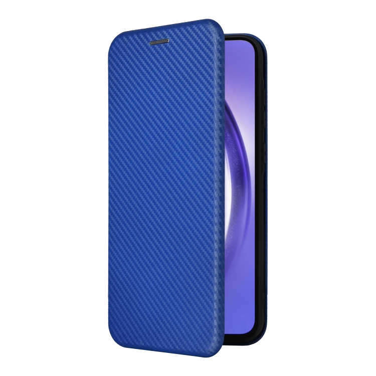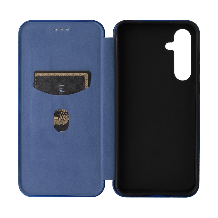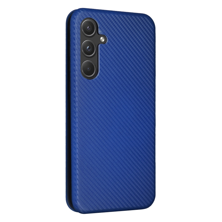 Funda de Cuero para Samsung Galaxy A55 5G con Tapa y Textura de Fibra de Carbono (Azul)