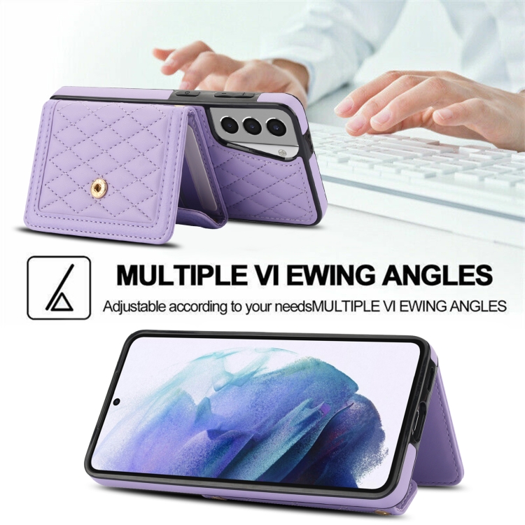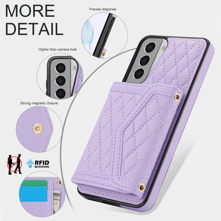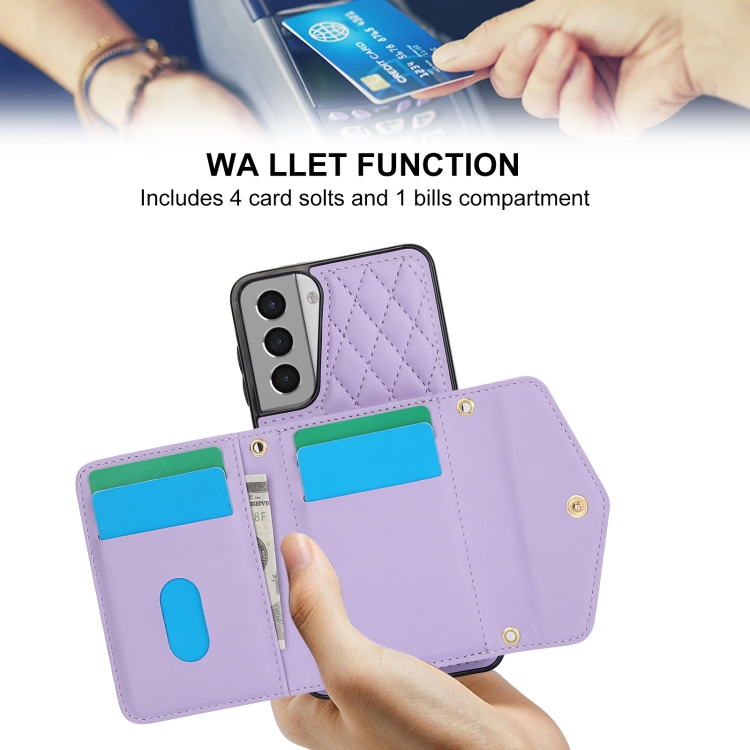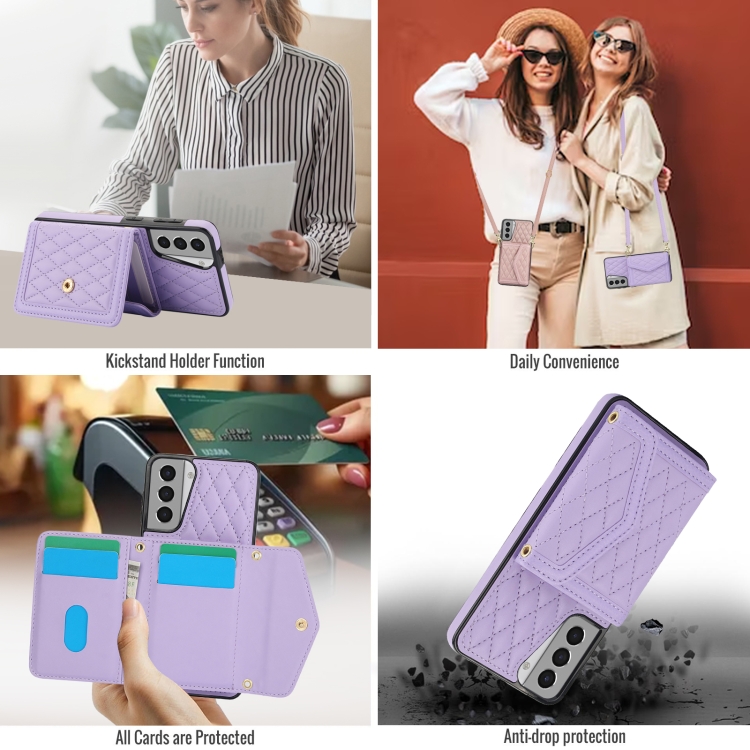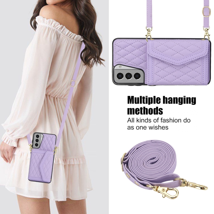 Estuche para teléfono Samsung Galaxy S21+ 5G con bolsa para tarjetas textura rómbica y cordón largo (Púrpura)