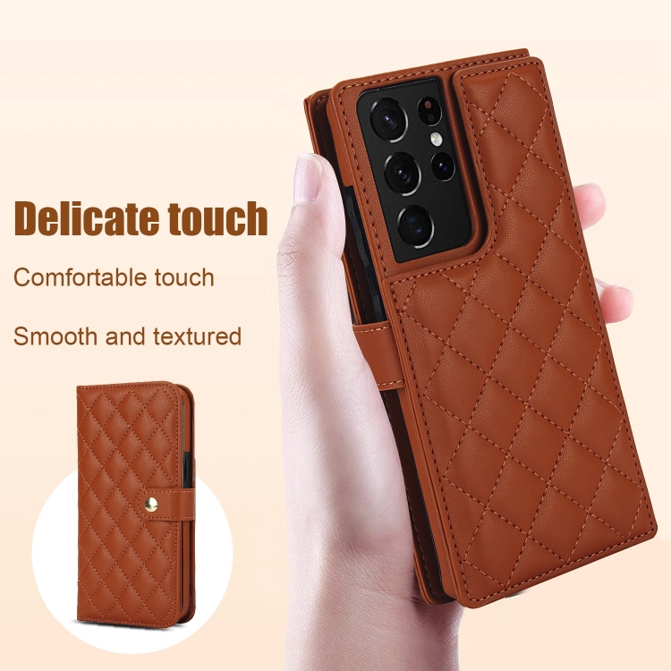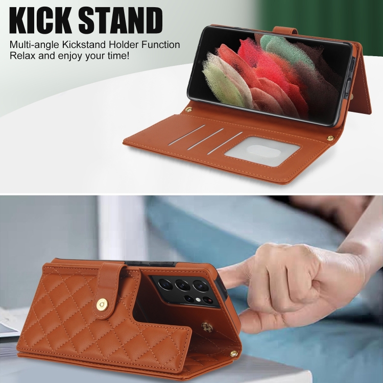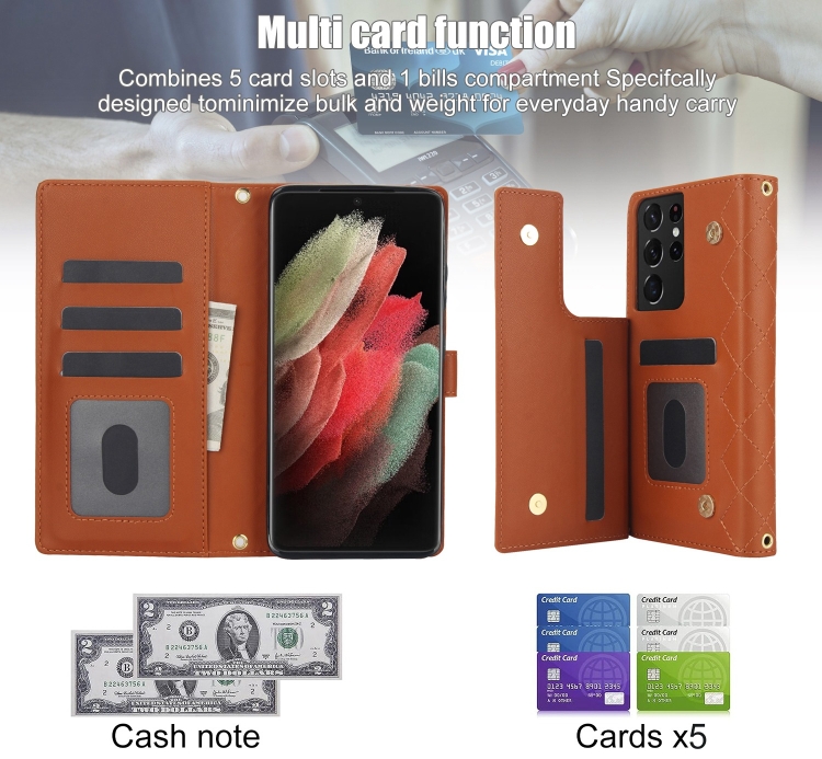 Estuche para Teléfono Samsung Galaxy S21 Ultra 5G Crossbody Cuero Rómbico Multifunción (Marrón)