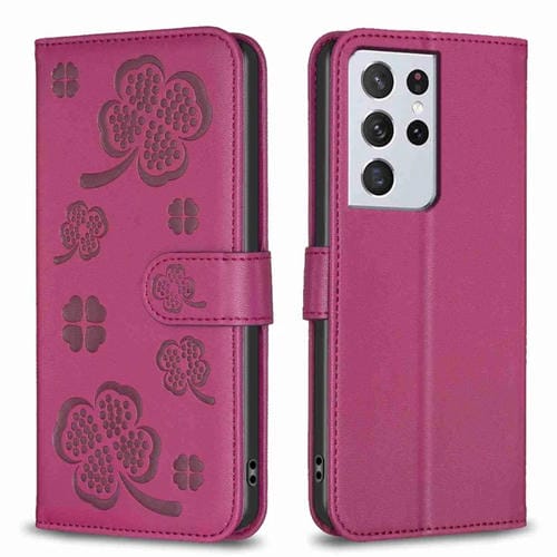 Funda para Teléfono Samsung Galaxy S21 Ultra 5G Cuero Relieve Cuatro Hojas (Rojo Rosa)