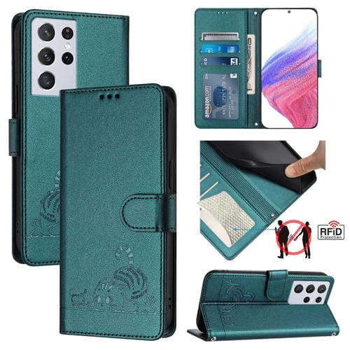 Estuche para Teléfono Samsung Galaxy S21 Ultra Cat Rat con Patrón En Relieve Rfid Pu y Correa para la Muñeca (Verde Pavo Real)