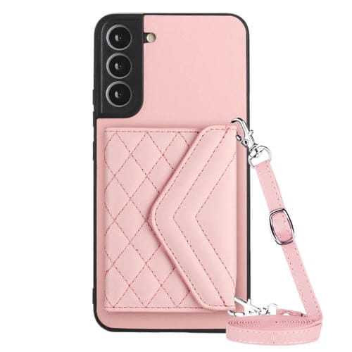 Estuche para Teléfono Samsung Galaxy S22 + 5G Rfid con Bolsa para Tarjetas Textura Rómbica y Cordón Largo (Oro Rosa)