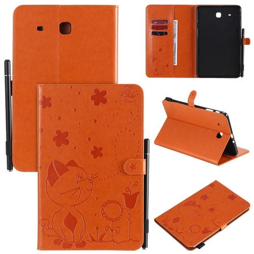 Funda protectora para Samsung Galaxy Tab E9.6 T560 con patrón Cat Bee en relieve, a prueba de golpes, cuero, tapa horizontal, soporte, ranuras para tarjetas, billetera y bolígrafo (Naranja)