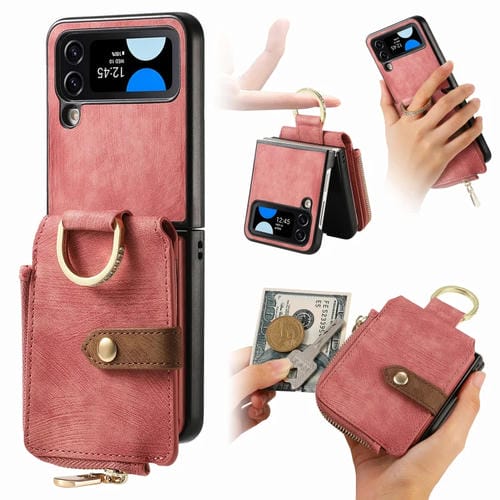 Funda para teléfono Samsung Galaxy Z Flip4 con billetera, cremallera y anillo, sensación de piel retro (Rosa)