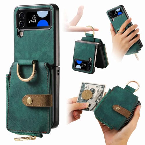 Funda para Teléfono Samsung Galaxy Z Flip4 con Billetera, Cremallera y Anillo con Sensación de Piel Retro (Verde)