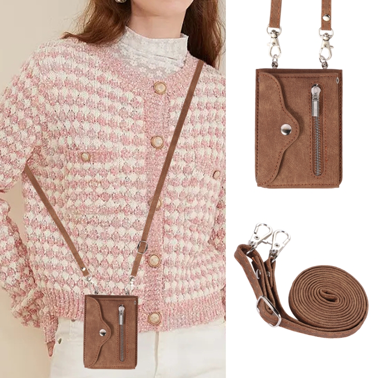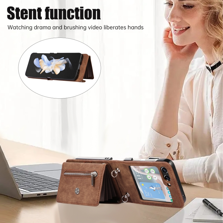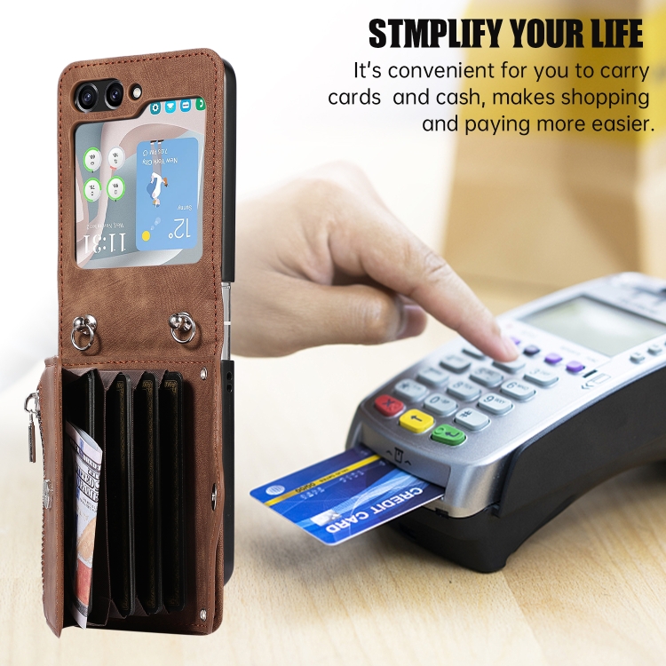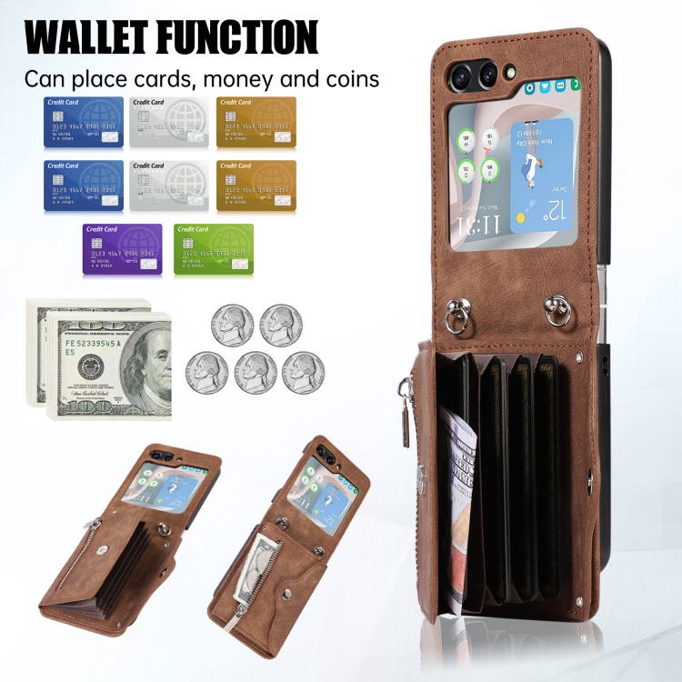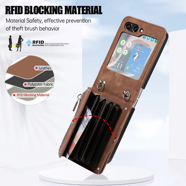 Estuche para Teléfono Samsung Galaxy Z Flip5 Cremallera Rfid Ranuras para Tarjetas con Cordón (Marrón)
