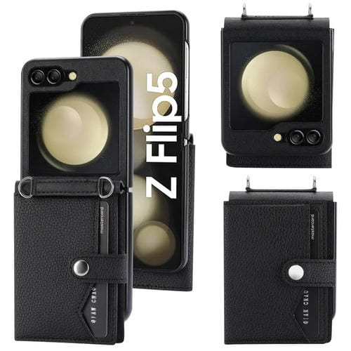 Funda para Teléfono Samsung Galaxy Z Flip5 con Tarjetero de Un Solo Botón Patrón Litchi y Cordón Largo (Negro)