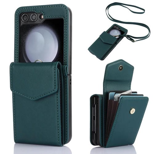 Funda plegable para teléfono Samsung Galaxy Z Flip5 con RFID, ranuras para tarjetas y cordón largo (Verde)