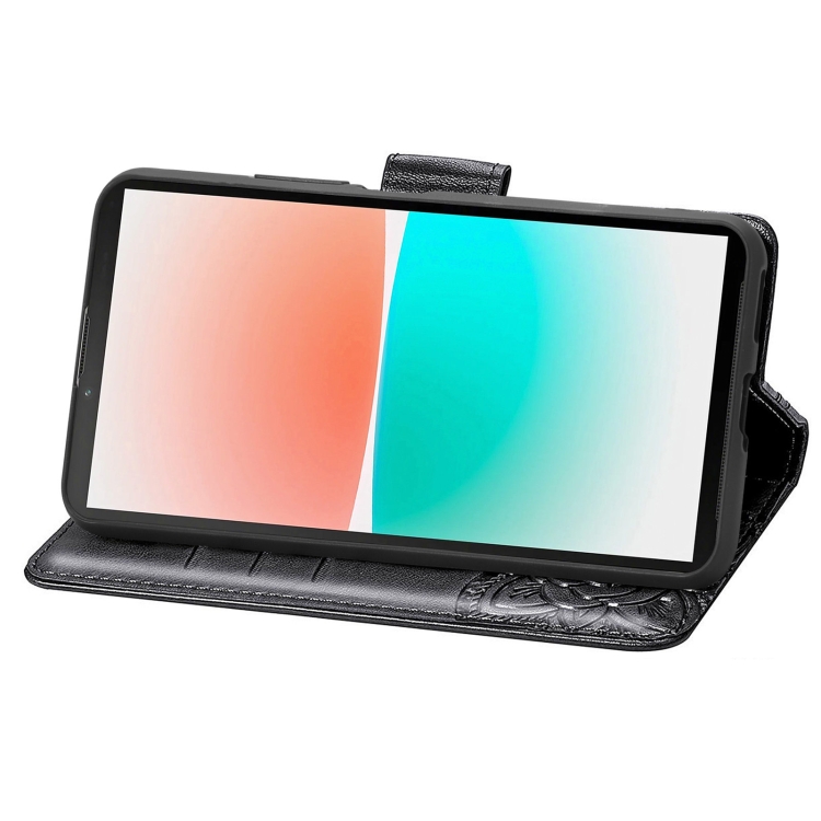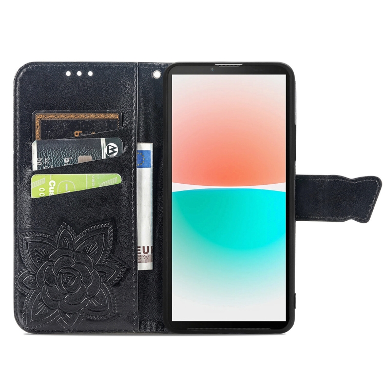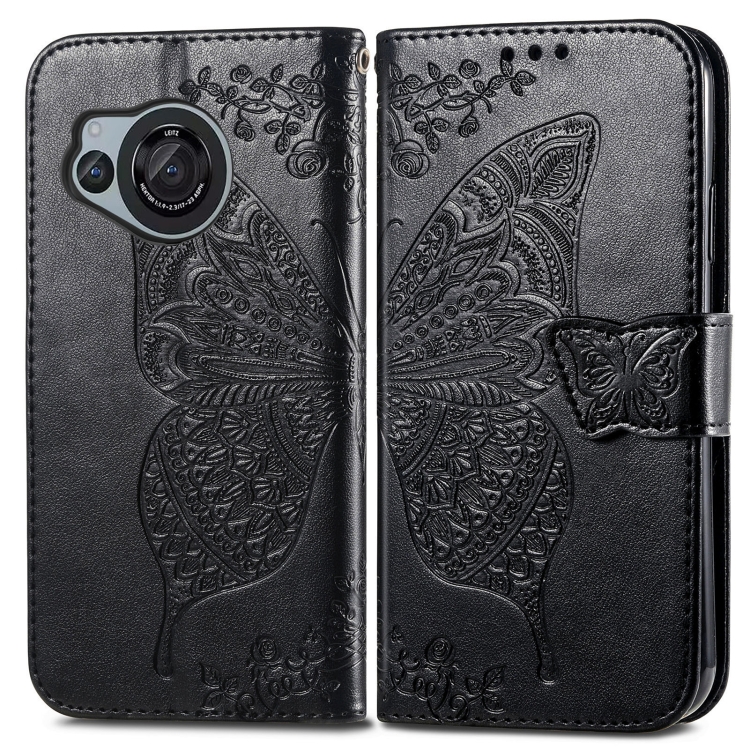Estuche para Sharp Aquos R8 Butterfly Love Flower de Cuero en Relieve (Negro)