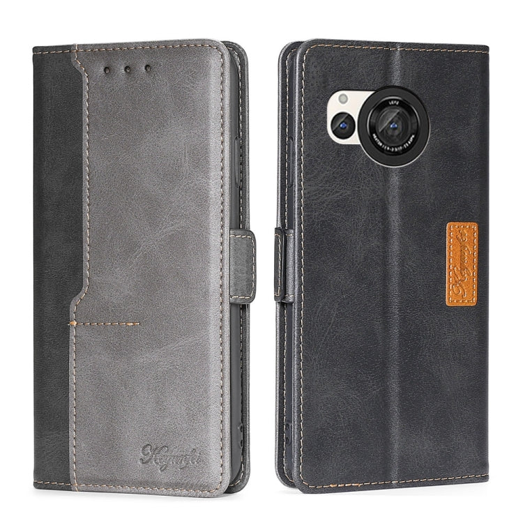 Funda de Cuero para Sharp Aquos R8 Sh-52D con Hebilla Lateral y Contraste de Color (Negro + Gris)