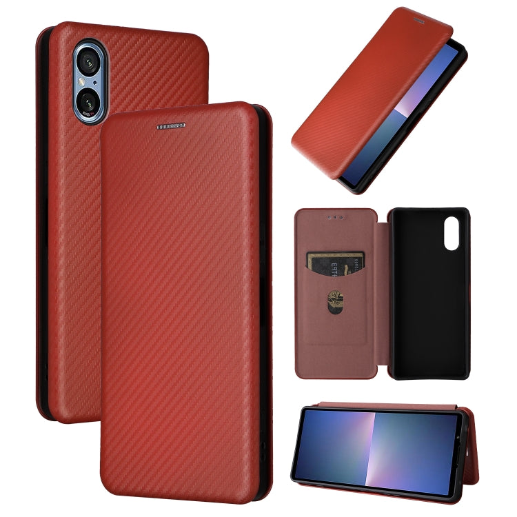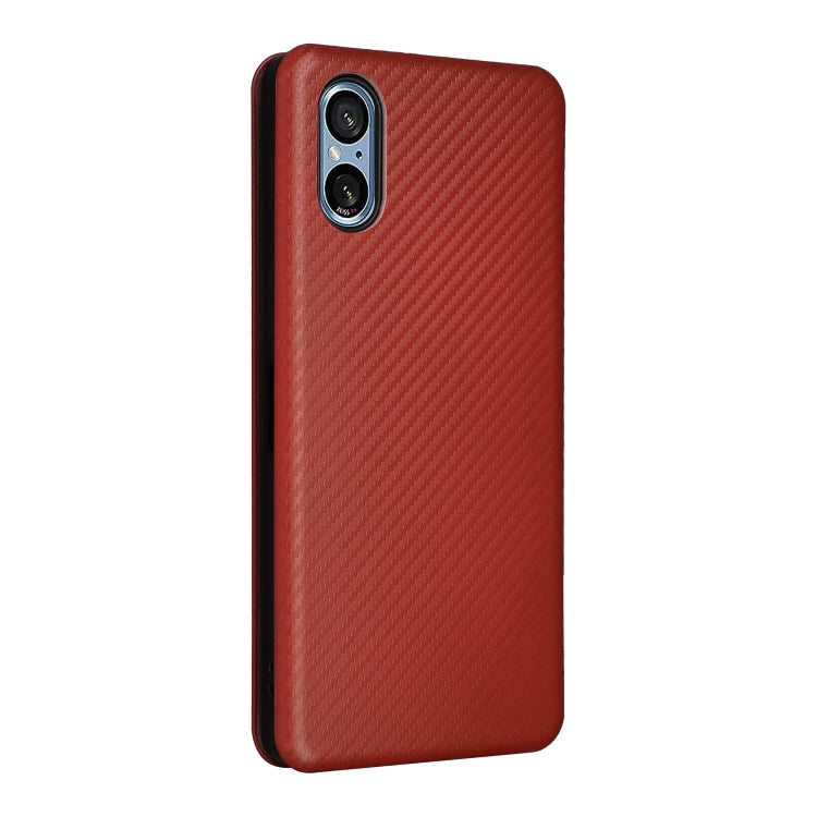 Funda de Cuero con Tapa para Sony Xperia 5 V (2023) con Textura de Fibra de Carbono (Marrón)
