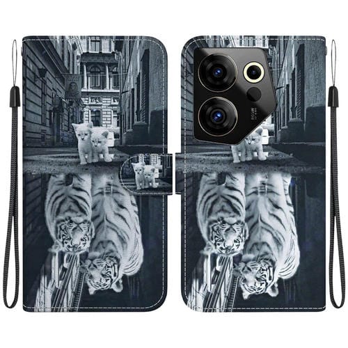 Funda de Cuero para Tecno Camon 20 Premier 5G con Dibujo Coloreado y Textura de Cristal (Reflejo de Tigre Gato)