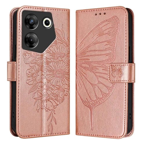 Funda de Cuero para Tecno Camon 20 Pro 5G con Mariposa en Relieve (Oro Rosa)