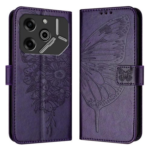 Funda de Cuero para Tecno Pova 6 5G con Mariposa en Relieve (Púrpura Oscuro)