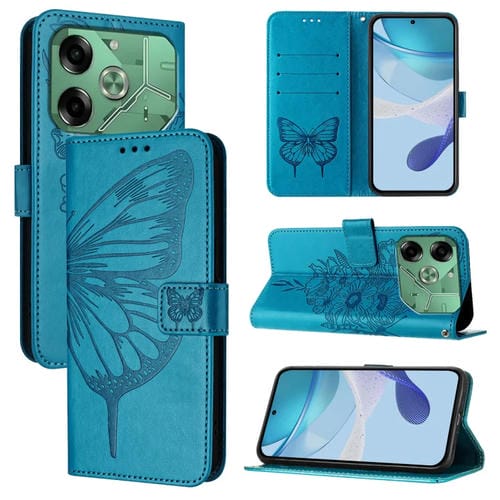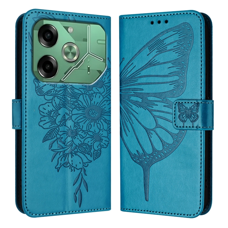 Funda de Cuero para Tecno Pova 6 con Mariposa en Relieve (Azul)