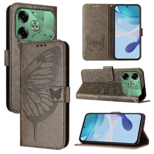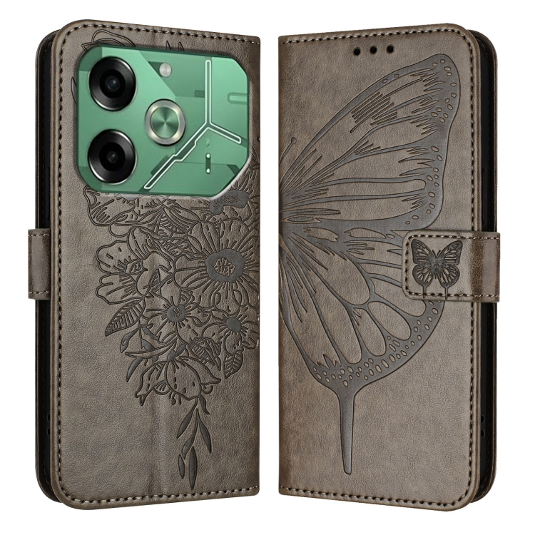Funda de Cuero para Teléfono Tecno Pova 6 con Mariposa en Relieve (Gris)