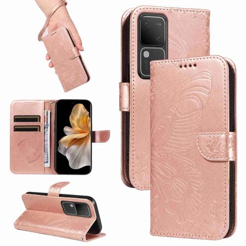 Para Vivo S18 5G Swallowtail Butterfly Funda de Cuero para Teléfono En Relieve (Oro Rosa)