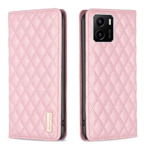 Para Vivo Y15S Diamond Lattice Funda de Teléfono con Tapa de Cuero Magnético (Rosa)