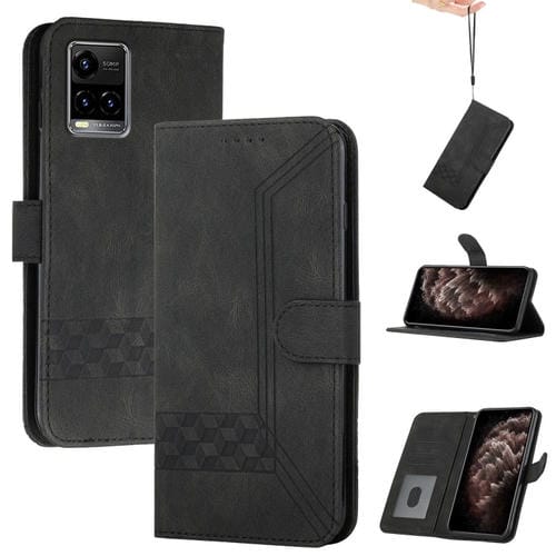 Para Vivo Y33S 4G Global / Y21 / Y21S / Y21T Funda para Teléfono de Cuero con Tapa con Sensación de Piel Cúbica (Negro)