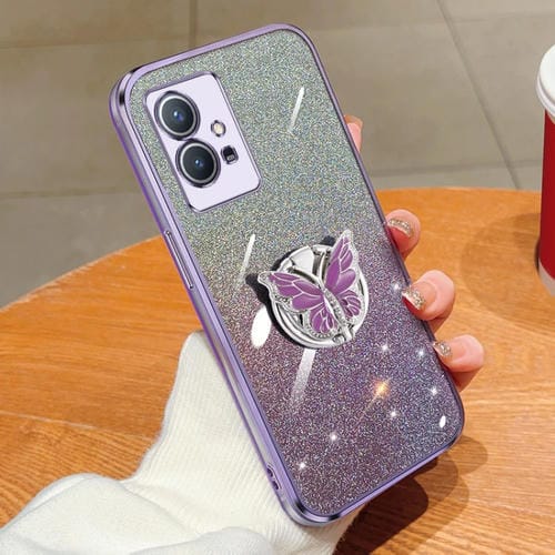 Para Vivo Y33S 5G / Y75 Funda para Teléfono de TPU con Soporte de Mariposa con Brillo Degradado Plateado (Púrpura)