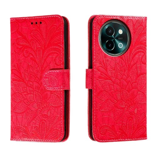 Para Vivo Y38 Funda para Teléfono de Cuero con Tapa y Estampado de Flores de Encaje (Rojo)
