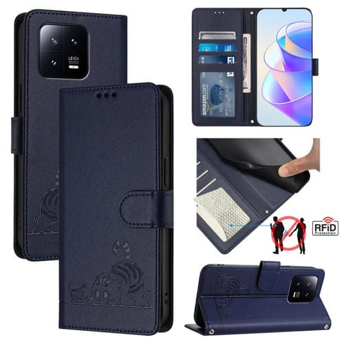 Para Xiaomi 13 Cat Rat Patrón En Relieve Rfid Pu Funda para Teléfono con Correa para la Muñeca (Azul)