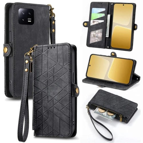 Para Xiaomi 13 Funda de Cuero con Hebilla Lateral para Billetera con Cremallera Geométrica (Negro)