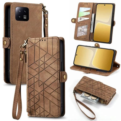 Para Xiaomi 13 Funda de Teléfono de Cuero con Hebilla Lateral de Billetera con Cremallera Geométrica (Marrón)