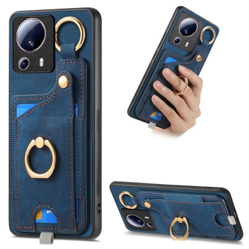 Para Xiaomi 13 Lite Funda para Teléfono con Bolsa para Tarjeta con Anillo y Sensación de Piel Retro con Lazo para Colgar (Azul)