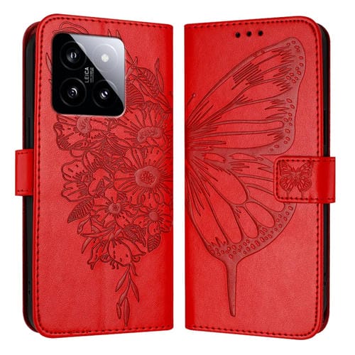 Para Xiaomi 14 5G Funda De Teléfono De Cuero Con Mariposa En Relieve Global (Rojo)