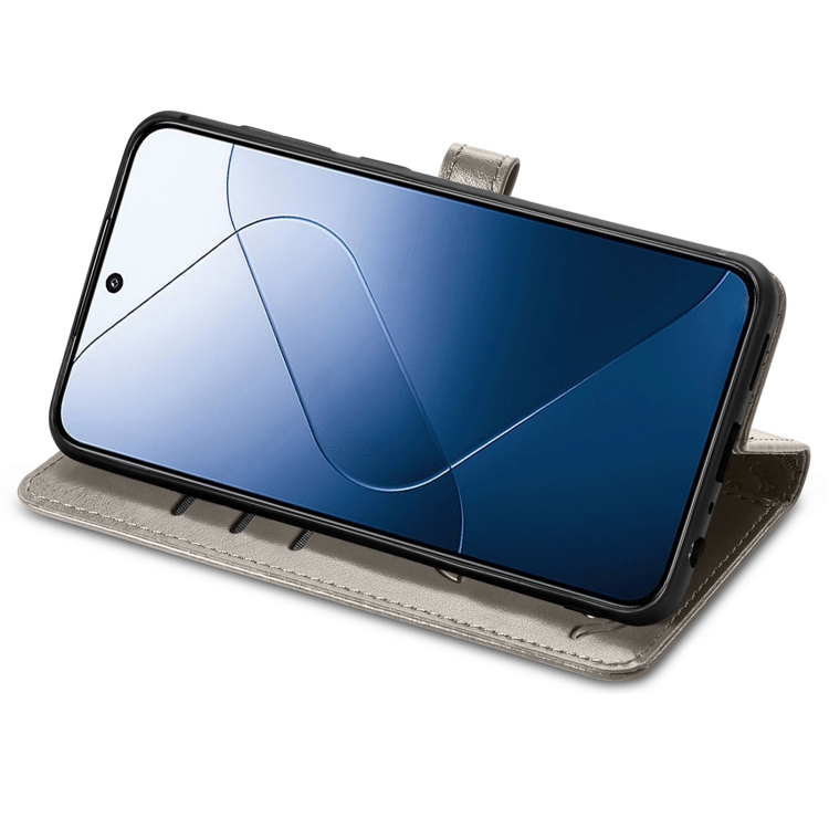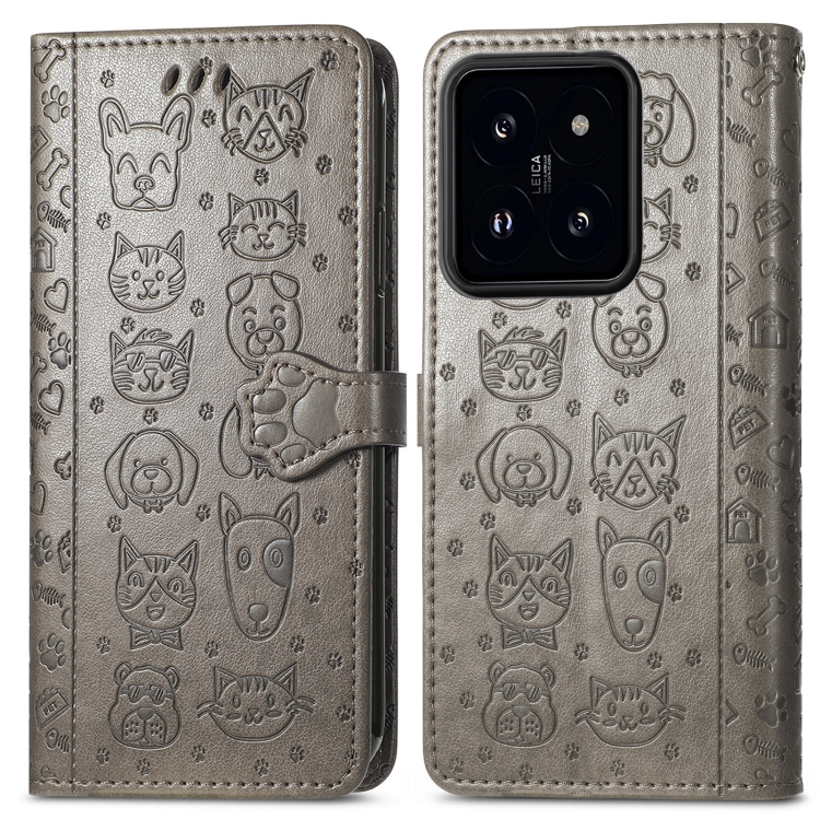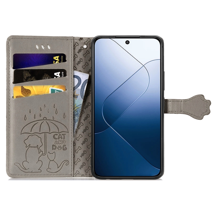 Para Xiaomi 14 Funda Para Teléfono De Cuero Con Relieve De Perro Y Gato (Gris)