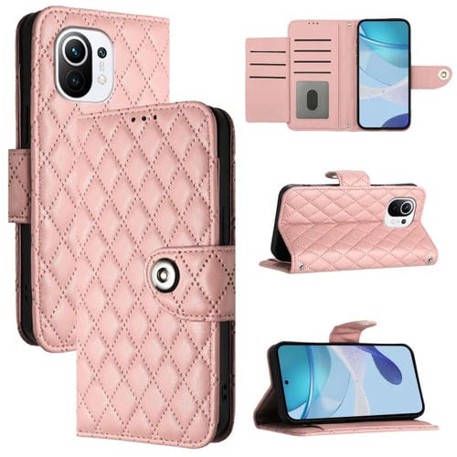 Para Xiaomi Mi 11 Funda de Cuero con Tapa con Textura Rómbica y Cordón (Rosa Coral)