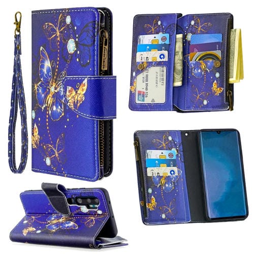 Para Xiaomi Mi Cc9 Pro / Note 10 Patrón de Dibujo de Colores Cremallera Funda de Cuero con Tapa Horizontal con Soporte y Ranuras para Tarjetas y Billetera (Mariposa Púrpura)