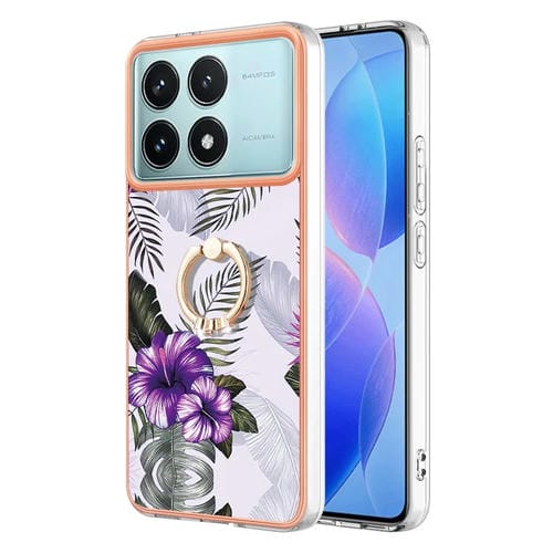Para Xiaomi Poco F6 Pro 5G Estuche a Prueba de Golpes con Patrón de Galvanoplastia Imd TPU con Soporte de Anillo de Diamantes de Imitación (Flor Morada)