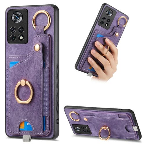 Para Xiaomi Poco X4 Pro 5G Funda para Teléfono con Bolsa para Tarjeta con Anillo y Sensación de Piel Retro con Lazo para Colgar (Púrpura)
