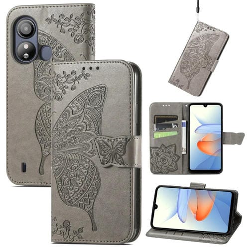 Funda para teléfono ZTE Blade L220 de Cuero con Relieve Flor de Amor y Mariposa (Gris)