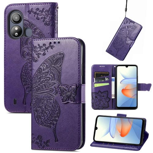 Funda para ZTE Blade L220 de Cuero con Relieve de Flor y Mariposa (Púrpura Oscuro)